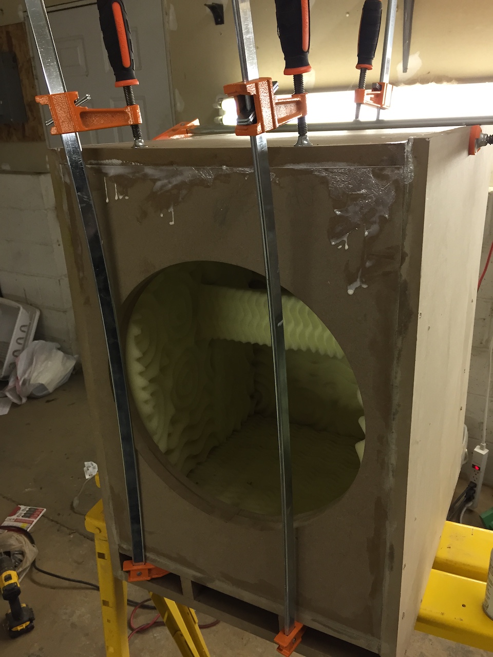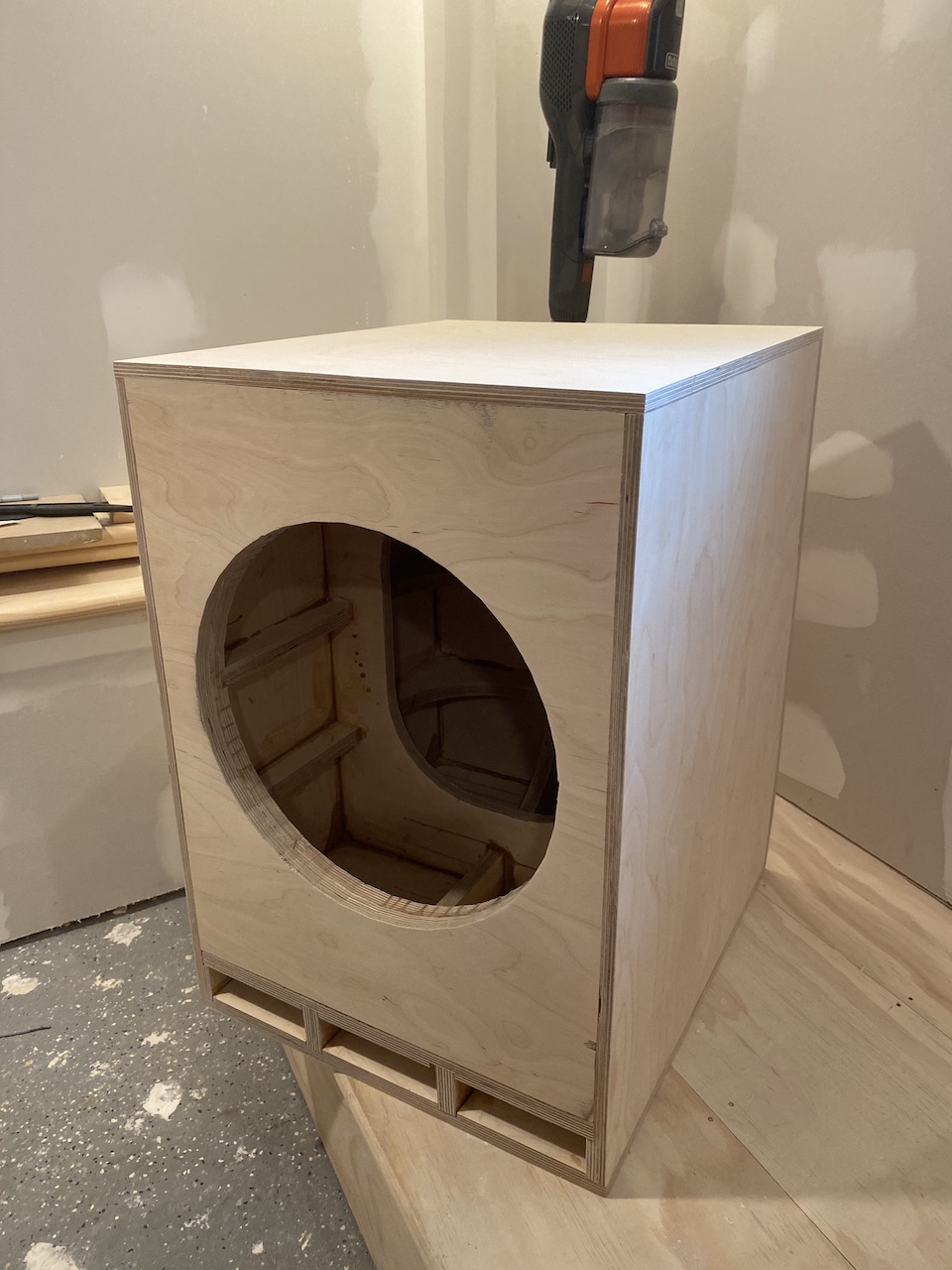 I spent the next couple weeks cutting out every piece, setting up glue jobs, and finshing the pair of subwoofers. This was my first major woodworking project and despite it being all straight cuts and square joints, it still came out a bit wonky.