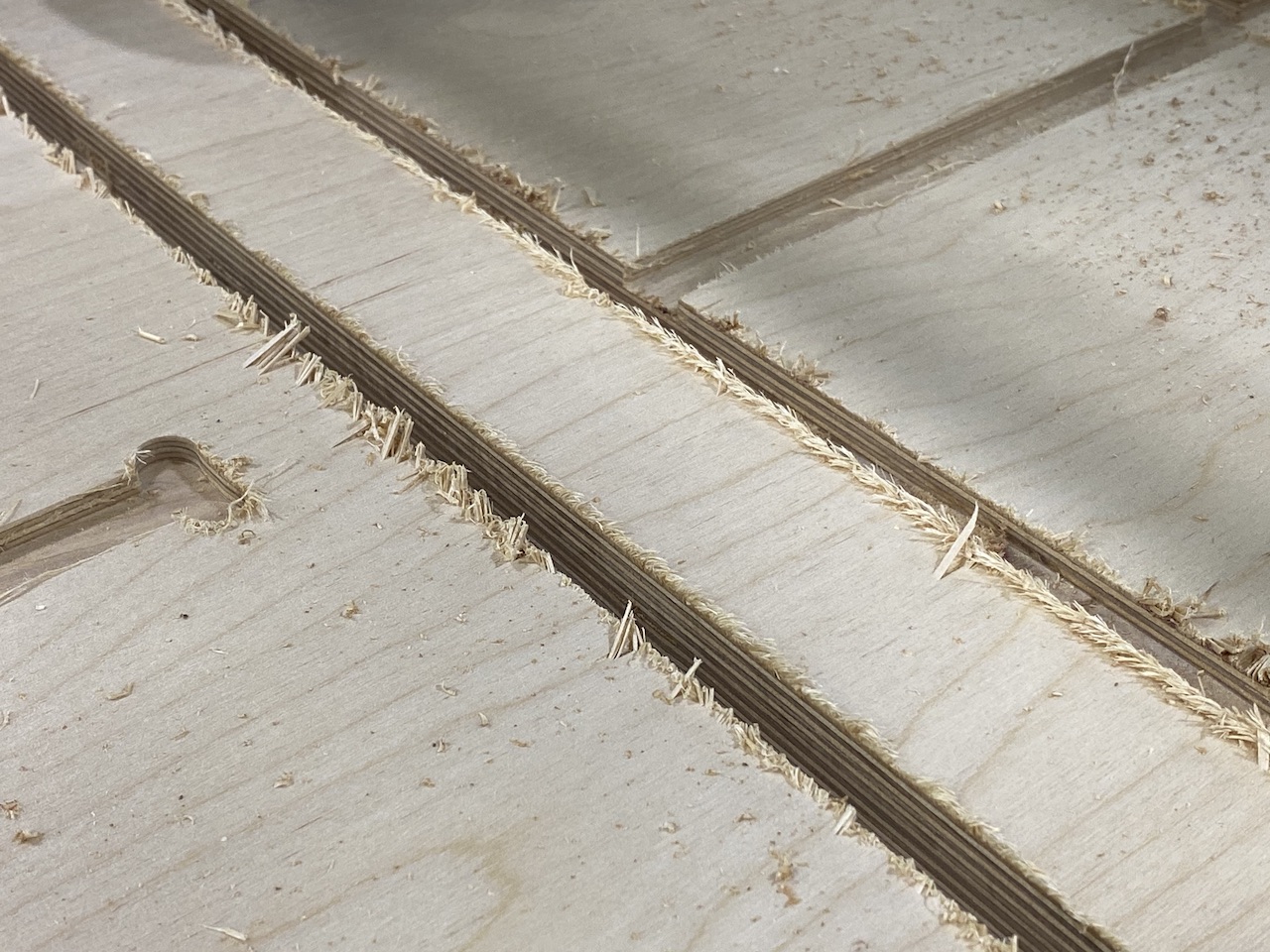Unfortunately since I had purchased an upcut bit intended for something softer like MDF, I ended up with a lot of chip out. I don't think the makerspace had a downcut 1/2" bit either, so I was a bit stuck. The chip out also got worse as the day went on so I think the bit may have been dulling.