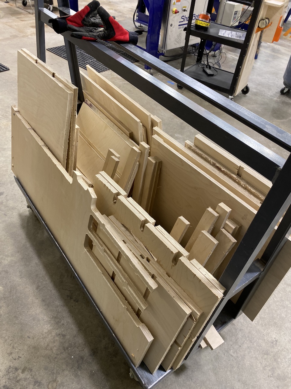 After 4 hours of CNCing, I had every piece cut and loaded on a cart ready to bring to my car.