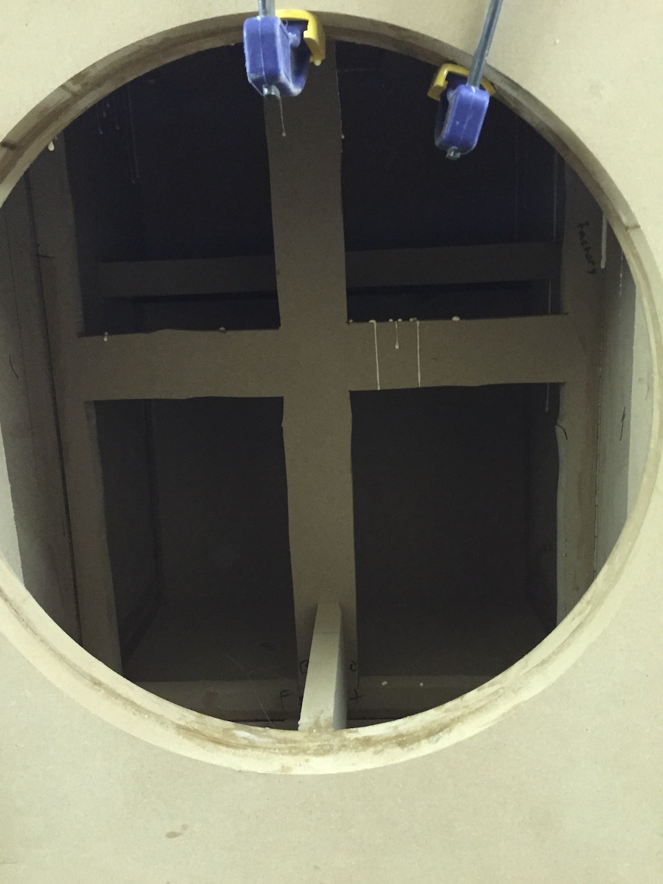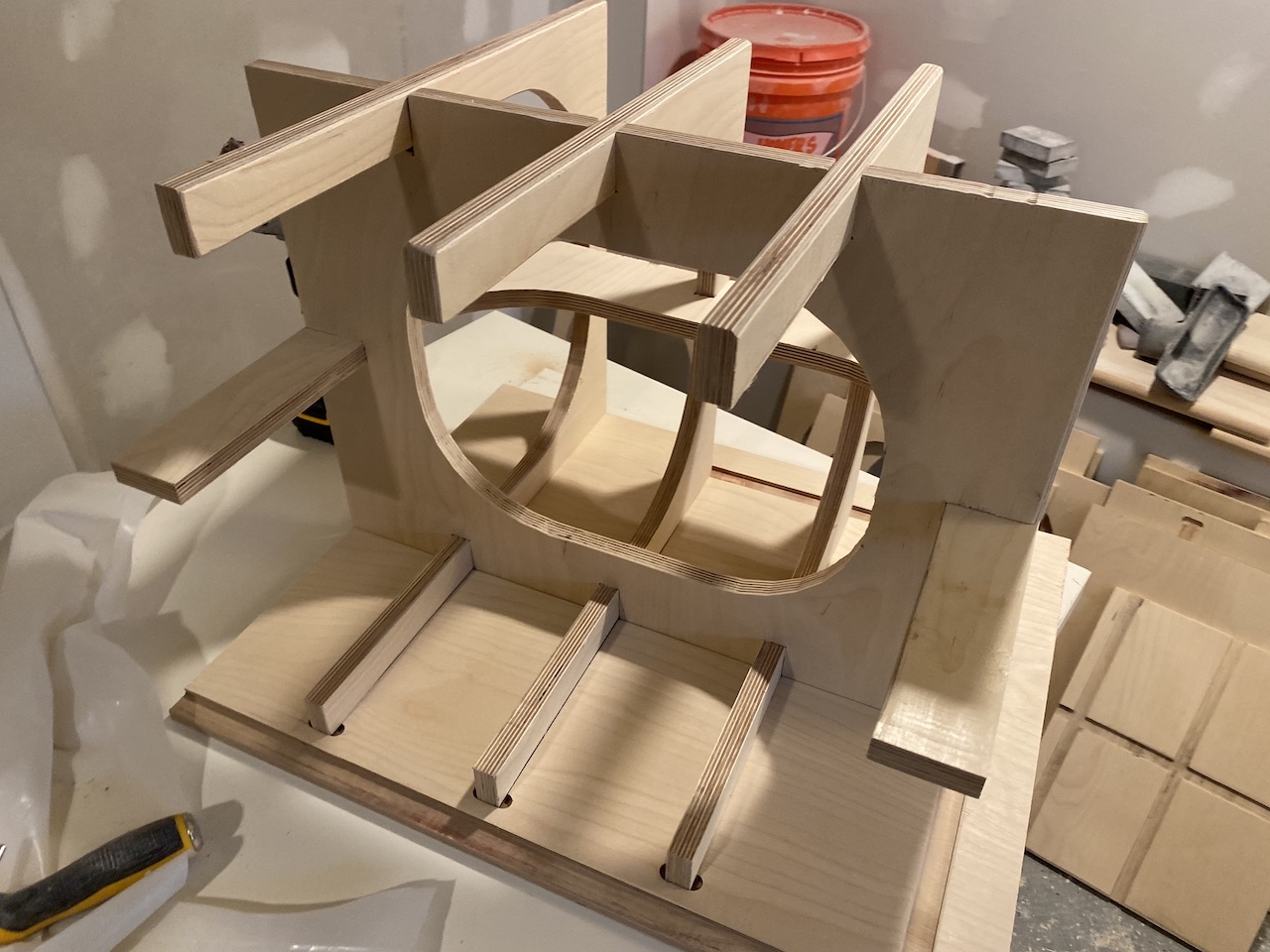 The inner support structure comes together. I ended up having to sand off a lot of the hard edges too to make a bit of a wedge shape so things could slide into place.