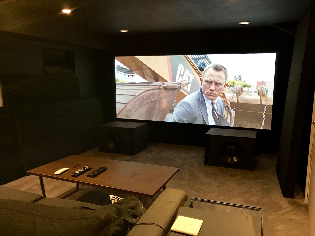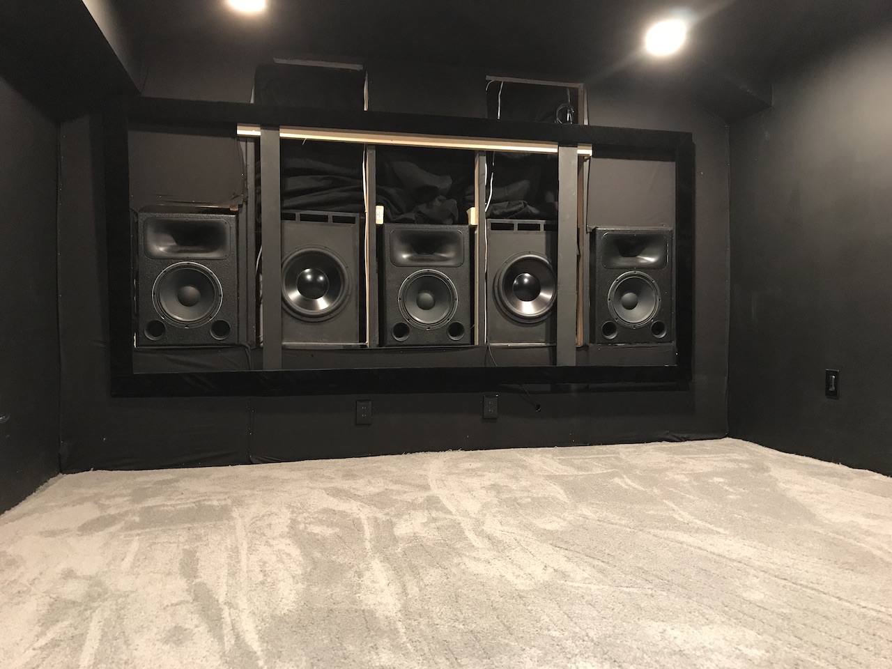 Eventually I stepped up to a 120" acoustically transparent Center Stage XD screen from Seymour AV, and was able to place the DIYSoundGroup HTM-12's behind the screen. The subwoofers still hung out in front though.
