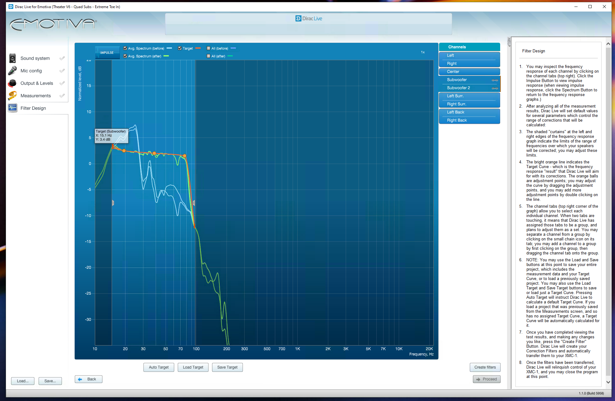 I set them all up, rewired my Crown XLS2500 amps to power each pair of subs in bridged mode, and re-ran Dirac Live room calibrations. The subwoofers after correction are able to provide a relatively flat response from 80 hz all the way down to 15 hz, which is just lovely.