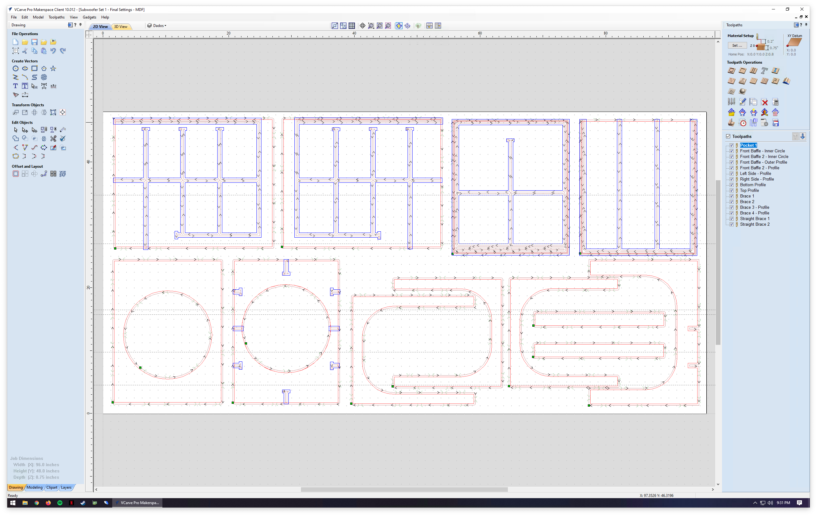 I ended up duplicating the models and then rearranging all the panels on two virtual 4'x8' sheets of 3/4" material, manually trying to place them around to make the most of the material. Since I was planning on building two sets of subwoofers, I duplicated some of the pieces on one sheet and also included any double sided pieces on that piece.