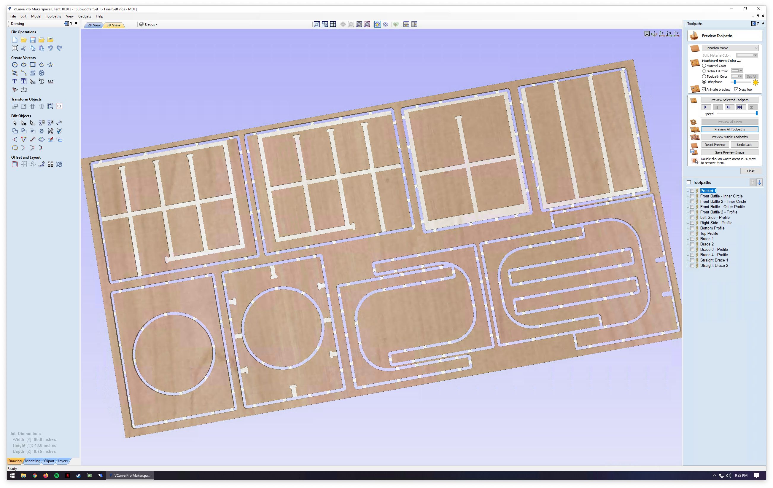 Eventually I was able to import correctly and start creating the toolpaths neccessary. I chose a 1/4" bit to start with, and after I created all the toolpaths I ran the estimate machining time. It came back with an astonishing 6 hour estimate... I was expecting something like 30 minutes! I then swapped the bit out for a 1/2" bit, re-ran calcuations and it came back with a much more sane 40 minutes.